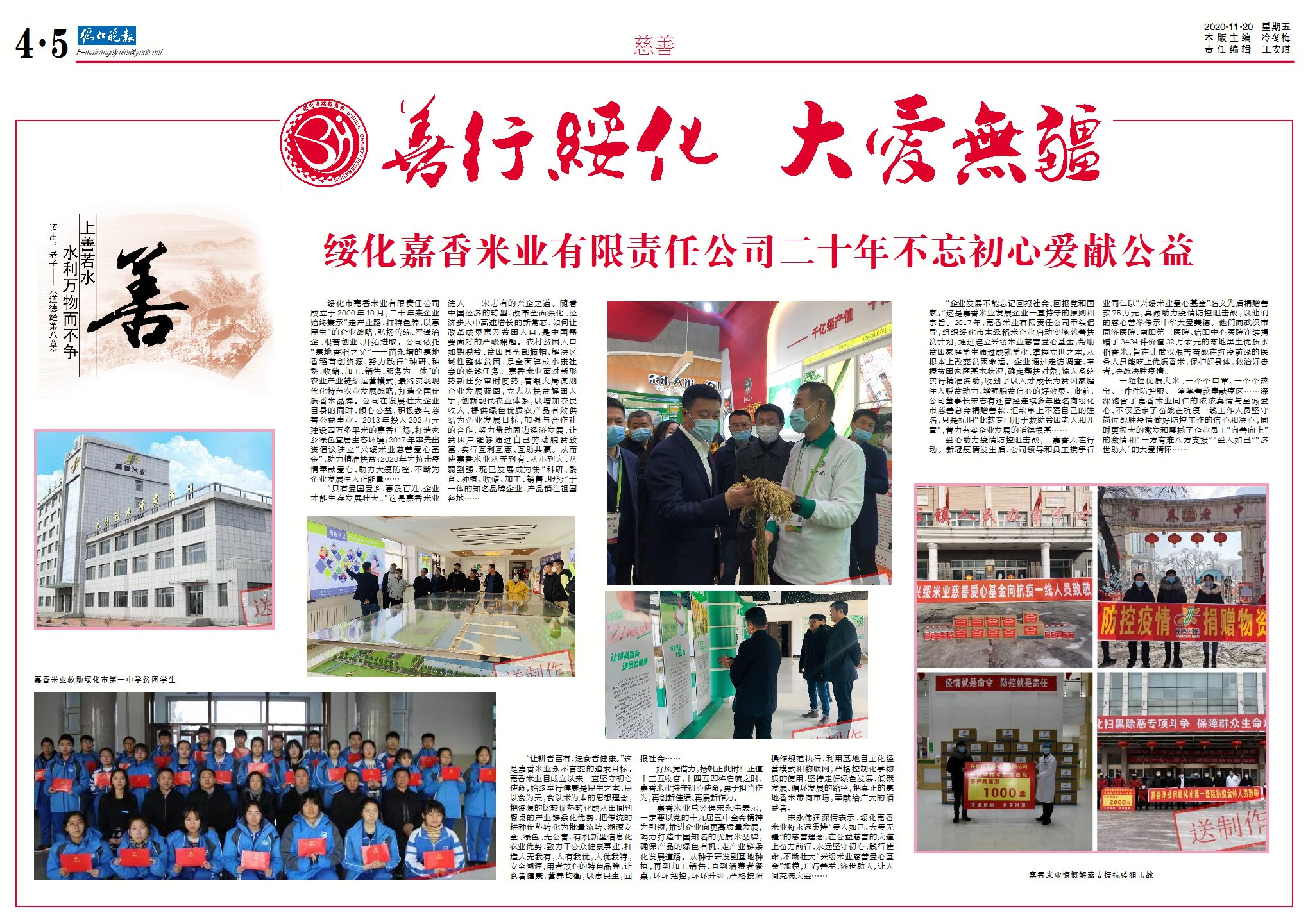 綏化晚報(bào):善行綏化 大愛(ài)無(wú)疆,綏化市嘉香米業(yè)有限責(zé)任公司二十年不忘初心愛(ài)獻(xiàn)公益~