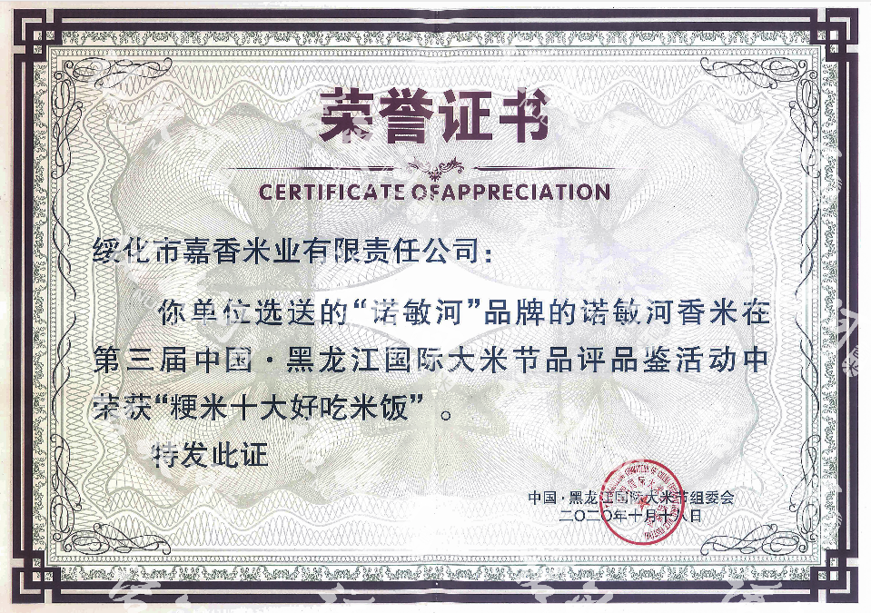 熱烈祝賀“諾敏河香米”榮獲第三屆中國·黑龍江國際大米節(jié)2020“十大好吃米飯”!