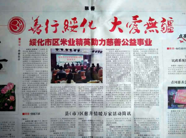 一元復始,春回大地愛滿家園。2月15日上午在綏化市嘉香米業(yè)旗艦店開業(yè)之際,嘉香米業(yè)捐資5萬元創(chuàng)建綏化市“興綏米業(yè)慈善愛心基金”,并將各位米業(yè)同仁對旗艦店開業(yè)的友情贊助4萬元也一并捐給綏化市慈善總會,活動中各企業(yè)深受教育和感染,現(xiàn)場紛紛發(fā)表感言,注資“興綏米業(yè)慈善愛心基金”至此綏化市“興綏米業(yè)慈善愛心......