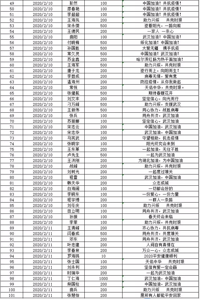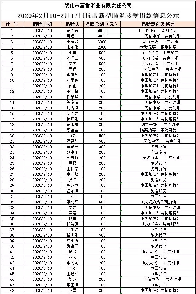 2020年春季新冠狀病毒肺炎爆發(fā),疫情發(fā)生后,嘉香米業(yè)積極行動(dòng),勇于擔(dān)當(dāng)。通過全國經(jīng)銷商聯(lián)系到疫情重點(diǎn)收治醫(yī)院—華中科技大學(xué)附屬武漢市同濟(jì)醫(yī)院,2月8日向該醫(yī)院三個(gè)院區(qū)共捐贈(zèng)25噸寒地香米價(jià)值25萬余元。2月12日又通過河南辦事處緊急調(diào)撥,向河南省疫情重點(diǎn)收治醫(yī)院南陽市醫(yī)專附屬第三醫(yī)院捐贈(zèng)600多件寒地香米價(jià)值2萬元;向信陽市中心醫(yī)院捐贈(zèng)寒地香米1000多件價(jià)值6萬元。2月10日通過“興綏慈善愛心基金會(huì)”向公司員工、全國經(jīng)銷商及當(dāng)?shù)孛讟I(yè)同行發(fā)起募捐倡議。截止2月16日募集善款19.7萬元。2月18日開始利用善款向綏化市區(qū)防控執(zhí)勤人員捐贈(zèng)電熱寶近500個(gè)。當(dāng)?shù)弥械谝会t(yī)院防疫物資特別是防護(hù)服緊缺公告后。嘉香米業(yè)公司第一時(shí)間與醫(yī)院取得聯(lián)系,并通過全國合作伙伴關(guān)系網(wǎng)聯(lián)系生產(chǎn)廠家。在興綏慈善基金募集的12.8萬元基礎(chǔ)上,公司再次追加捐款25.6萬元,訂購了3000套防護(hù)服和醫(yī)療防護(hù)物資,其中1700套防護(hù)服捐贈(zèng)給市第一醫(yī)院,1000套捐贈(zèng)給市傳染病醫(yī)院第二病區(qū),200套捐贈(zèng)給市殯葬管理所,100套捐贈(zèng)給市救助站,2月25日,向綏化市城市養(yǎng)老服務(wù)中心捐贈(zèng)現(xiàn)金1萬元,防護(hù)口罩500個(gè)??們r(jià)值12500元。向北林區(qū)秦家鎮(zhèn)政府捐贈(zèng)防護(hù)口罩3000個(gè),防護(hù)服30套,電熱寶30個(gè),酒精10桶。總價(jià)值1.9萬余元。嘉香米業(yè)公司不遺余力的為慈善事業(yè)作貢獻(xiàn),為堅(jiān)守在一線的抗疫人員加強(qiáng)防護(hù),保障抗疫人員的生命健康安全。