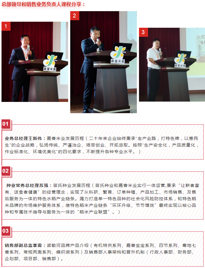 5日,2020年度全國銷售培訓(xùn)會議進(jìn)行中,嘉香米業(yè)領(lǐng)導(dǎo)班子、全國各辦事處領(lǐng)導(dǎo)和銷售骨干共同參加了本次會議。此次培訓(xùn)由淺入深,涵蓋企業(yè)相關(guān)的各個(gè)方面。從企業(yè)發(fā)展史、企業(yè)文化,到品牌產(chǎn)品的介紹,再到各類型客戶的開發(fā)等,展開了深入而又全面的探討學(xué)習(xí)。讓銷售人員接受到了系統(tǒng)、專業(yè)、全面的培訓(xùn)。