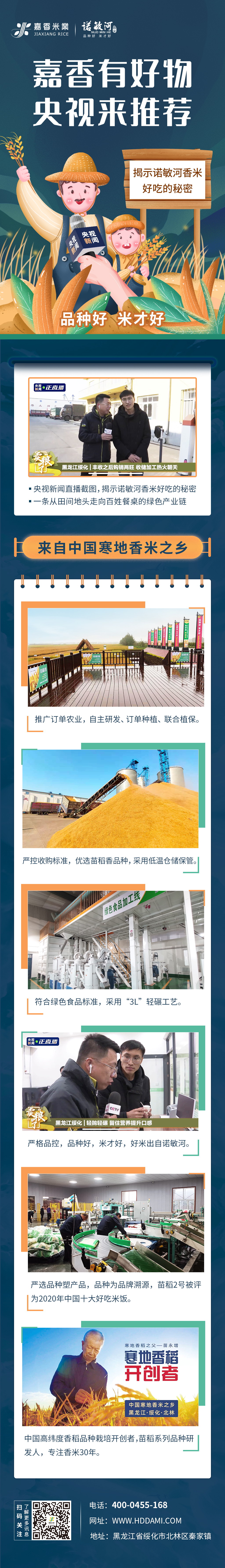 CCTV-13央視新聞頻道嘉香米業(yè)實地采訪報道,30分鐘時長,從訂單種植,收儲,加工等環(huán)節(jié),進行了展現(xiàn)。品種好,米才好,好米就選諾敏河系列香米,好吃有“稻”理~~~